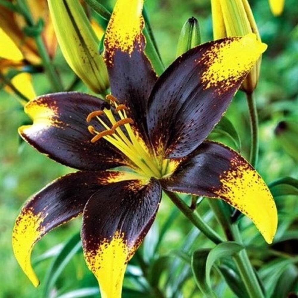 Cumpără Bulbi de Crini Parfumati Lion Heart, mărime 18+! Un contrast fascinant între negru catifelat și galben intens, perfect pentru o grădină exotică. Calitate premium și livrare rapidă!