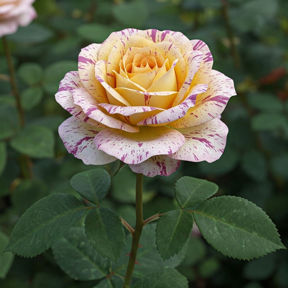 Trandafirul "Lavandă" este un soi deosebit de spectaculos și rar, remarcându-se prin florile sale mari și elegante, cu un model cromatic unic. Petalele interioare au o bază de galben pal sau crem, iar cele exterioare sunt albe, pătate și striate cu un mov-lavandă vibrant. Acest aspect bicolor, de tip vintage și plin de farmec, transformă fiecare floare într-o mică operă de artă, oferind un interes vizual deosebit în orice grădină.
