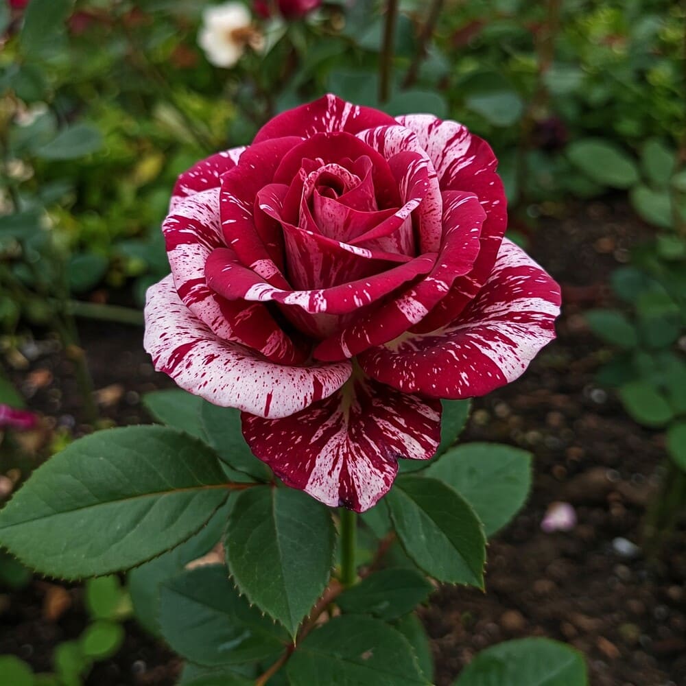 Butaș Trandafir "Picături de Cer" (Anul 3): Trandafir arbustiv cu flori striate, roșu și alb. Butaș matur, cu rădăcină împachetată, gata de plantare.