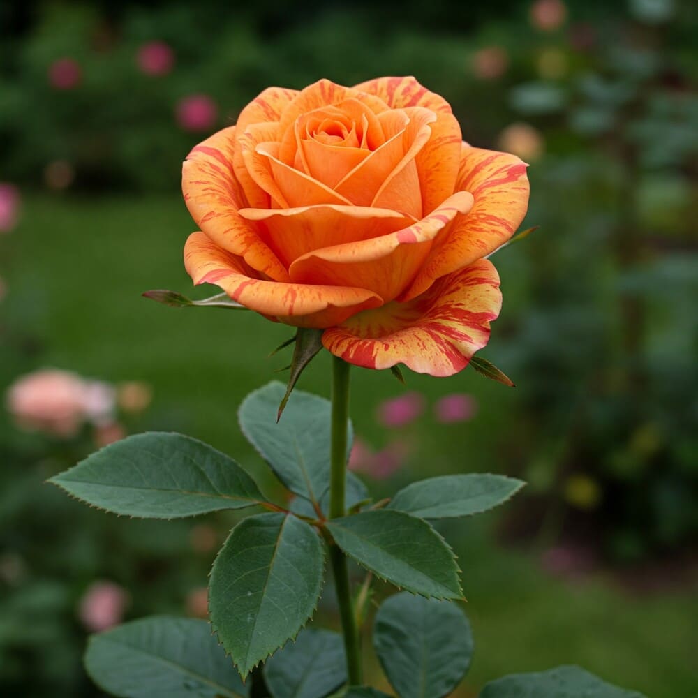 Trandafirul "Soare Striat" este un soi deosebit de spectaculos, remarcându-se prin florile sale mari și elegante, cu un model cromatic vibrant. Petalele au o bază de portocaliu solar, pătată și striată cu un roșu intens. Acest aspect bicolor, plin de viață, transformă fiecare floare într-o mică operă de artă, oferind un interes vizual deosebit în orice grădină.