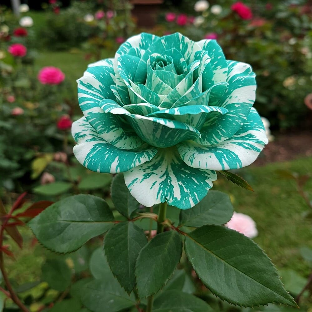 Trandafirul "Turcoaz" este un soi extrem de rar și spectaculos, remarcându-se prin florile sale cu un model cromatic unic și exotic. Petalele au o bază de turcoaz intens, pătată și striată cu alb imaculat. Această combinație neobișnuită, plină de viață și sofisticată, transformă fiecare floare într-o mică operă de artă, oferind un interes vizual deosebit în orice grădină.