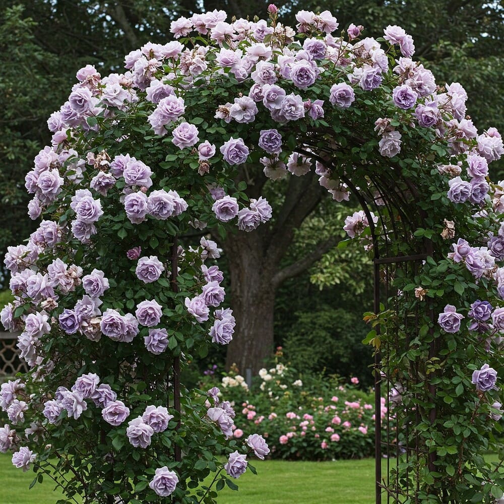 Trandafirii cățărători "Light Blue" aduc o notă de serenitate și culoare delicată în grădina ta. Ideali pentru a îmbrăca ziduri, pergole, garduri sau orice suport vertical, acești trandafiri încântă cu florile lor în nuanțe suave de albastru deschis, lavandă pal sau lila.