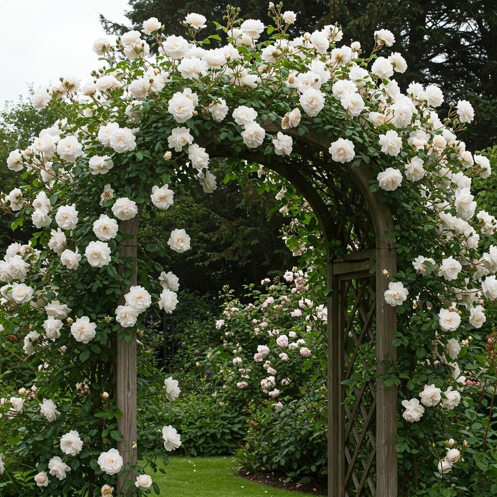 Trandafirii cățărători "White" aduc un val de eleganță pură și un parfum delicat în grădina ta. Ideali pentru a îmbrăca ziduri, pergole, garduri sau orice suport vertical, acești trandafiri încântă cu florile lor albe imaculate.
