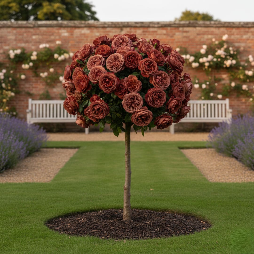 Cumpără Trandafir Pomisor Chocolat Romantica H 160cm! Culoare rară maro ciocolatiu, parfum puternic. Plantă Anul 4, calitate superioară. Livrare rapidă direct de la producător.