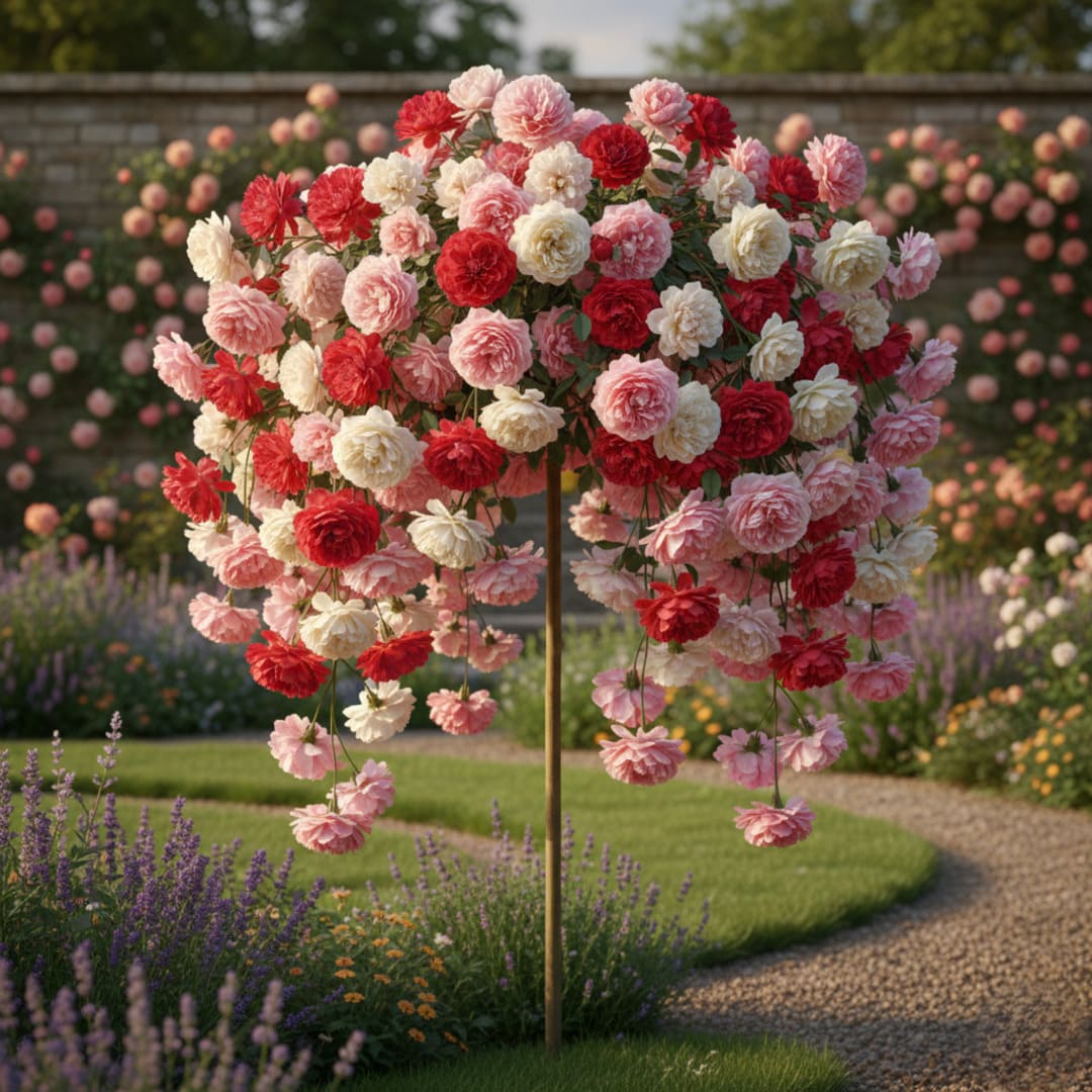 Tip Produs: Trandafir Pomisor Curgător Altoit (Weeping Standard Rose Tree), spectacol cromatic cu două nuanțe.