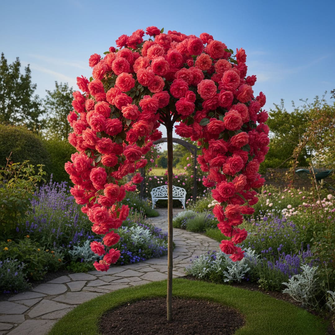 Tip Produs: Trandafir Pomisor Curgător (Weeping Standard Rose Tree) sau Trandafir Plângător, cu o siluetă distinctivă.